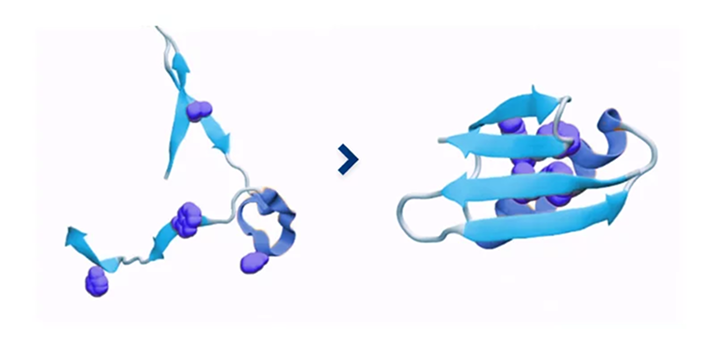 Auf der Abbildung ist der natürliche Prozess der Bildung geordneter Wasserschichten auf der Oberfläche von Proteinen zu erkennen. Diese Schichten lösen die Proteinfaltung aus und ermöglichen so deren spezifische Funktion.